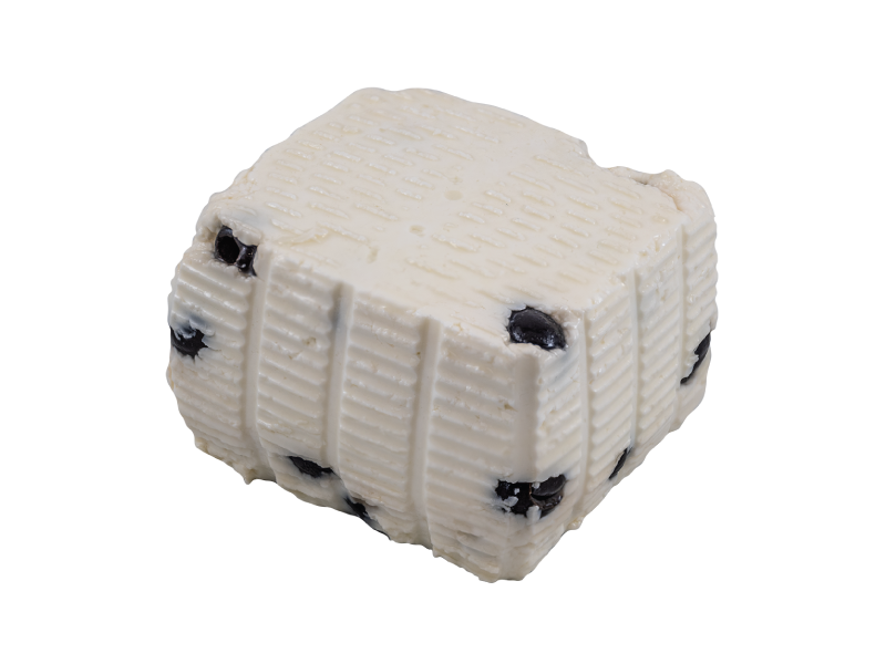 Formaggio fresco da latte vaccino, di provenienza unicamente aziendale, lavorato a crudo con aggiunta di olive e posato in fuscella.